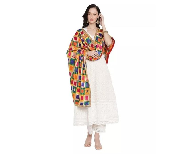 कैजुअल और नॉर्मल वियर के लिए इस मल्टीकलर फुलकारी दुपट्टे के साथ सूट को चुन सकते हैं। सूट पर चिकनकारी का वर्क किया गया है, जिसका लुक अनारकली का है। व्हाइट सूट के साथ मल्टीकलर का दुपट्टा काफी यूनिक लुक देगा।