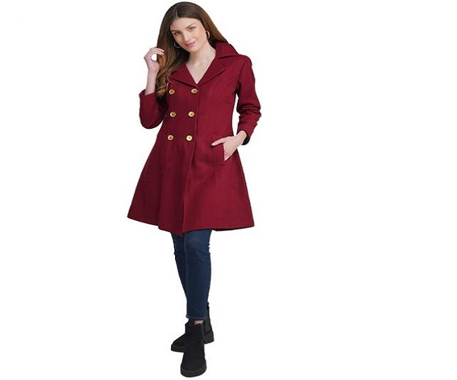 इस Coat For Women Winter की लम्बाई घुटनो तक है। यह मैरून रंग में आता है, जो बहुत ही अट्रैक्टिव है। इसका रेगुलर फिट है। गंदा होने पर इसको ड्राई क्लीन कर सकते हैं। यह Ladies Coat सॉफ्ट फैब्रिक के साथ आता है, जिसको पूरा दिन आराम से पहन सकते हैं। AOL Women's Long Coat Price: Rs 3319.