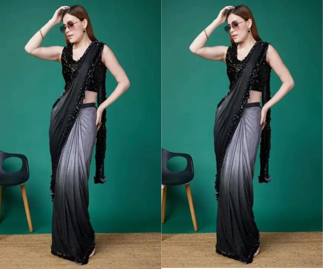 ब्लैक Readymade Saree के साथ ब्लैक कलर का ब्लाउज भी दिया जा रहा है, जिसे आप अपने साइज के अनुसार चुन सकती हैं। यह साड़ी दो कलर के कॉम्बीनेशन से मिलकर बनाई गई है, जिसमें ग्रे का टेक्चर भी शो हो रहा है। लाइट मेकअप के साथ महिलाएं इसमें काफी बढ़िया लुक ले सकती है। Farewell Saree Price: Rs 2150.