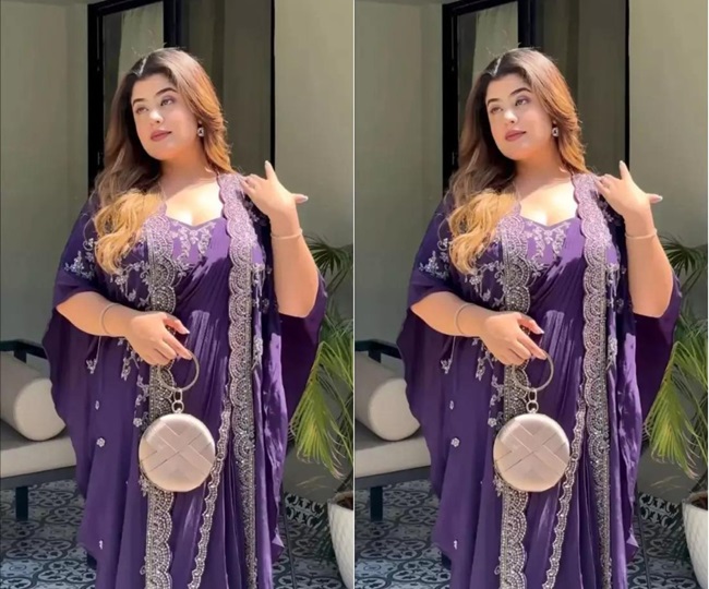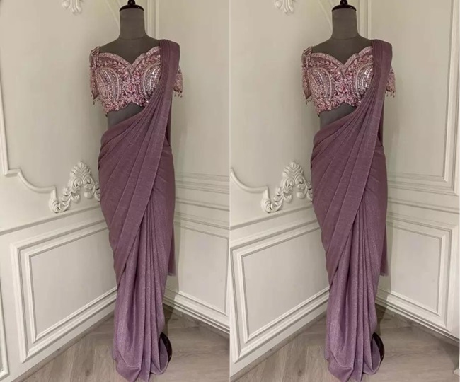 अब जरा इस पर्पल कलर की साड़ी को देखिए, जिसका लुक काफी ऑसम लग रहा है। इस पर्पल साड़ी में कमाल की कारीगरी देखने को मिलेगी, जो साड़ी की शोभा चार-गुना बढ़ा रही है। इस पर्पल कलर की रेडी टू वियर साड़ी में सिल्वर कलर का डिजाइन देखने को मिलेगा, जिसे आप आने वाले किसी भी शादी-पार्टी में पहन सकती हैं।