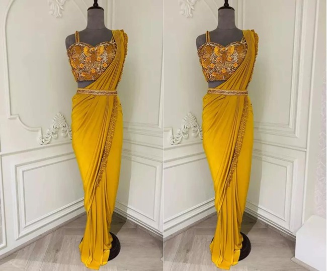 यह येलो कलर की रेडी टू वियर साड़ी में एक कमरबंद भी दिया जा रहा है, जिसे साड़ी पहनने के साथ कैरी कर सकती है। इस साड़ी में कॉटन प्लस सिल्क का काम किया गया है, जो स्किन फ्रेंडली है। पूरे दिन कैरी करने और ट्रेवलिंग करने के लिए इसका चुनाव कर सकती हैं। Ready To Wear Saree Price: Rs 3000.