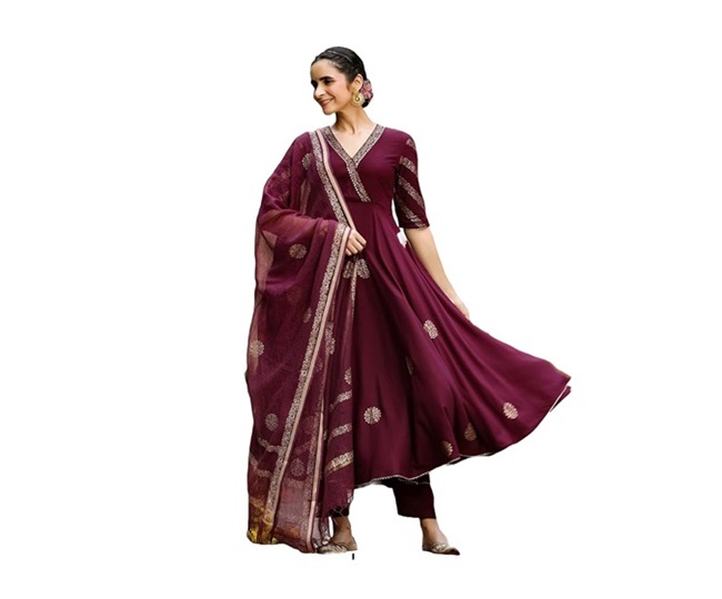 महिलाओं में घेर वाले अनारकली कुर्ते का क्रेज बड़ता जा रहा है। एथनिक लुक का यह स्टाइल कुर्ता महिलाओं को बहुत सुंदर लगता है। यह वाइन कलर में मिल रहा है जो हर स्किन टाइप पर जचेगा और आप बहुत सुंदर लेंगगी। इसमें वी-नेक और 3/4 आस्तीन देकर स्टाइल किया गया है। S से लेकर XXL तक हर साइज में यह मिल जाएगा जिसकी फिटिंग बढ़िया होगी।