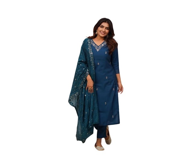 सेट में 1 कुर्ता, 1 पैंट और 1 दुपट्टा मिलता है। इसके घेर और अनारकली स्टाइल के कारण मिलाओं ने इसे काफी पसंद किया है और टॉप रेर्टिंग भी दी है। इसे कॉटन ब्लैंड मटेरियल के बनाया गया है जिससे यह दिखने के साथ पहनने में भी कम्फर्टेबल है, इसे आप आराम से पूरे दिन के लिए पहन सकते है। GoSriKi Kurta Set Price: Rs 849.