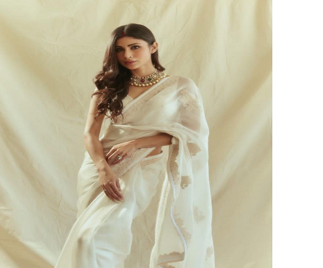 इस सफेद चिकनकारी साड़ी में मोनी रॉय बिल्कुल शाही लग रही है, इसमें आपको फ्लावर बूटी का वर्क भी मिल जाता है, जो इस साड़ी को बहुत ही खूबसूरत लुक देता है।