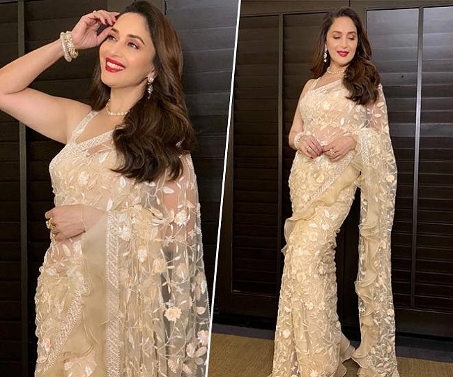 माधुरी दीक्षित इस ऑफ व्हाइट साड़ी में बहुत ही खूबसूरत लग रही है। इस पर बूटी से वर्क किया हुआ है, जो इसके लुक को और भी खूबसूरत बना रहे हैं। इनके साथ मिनिमल मेकअप रखकर आप शादी में अपनी खूबसूरती में चार चाँद लगा सकती है।