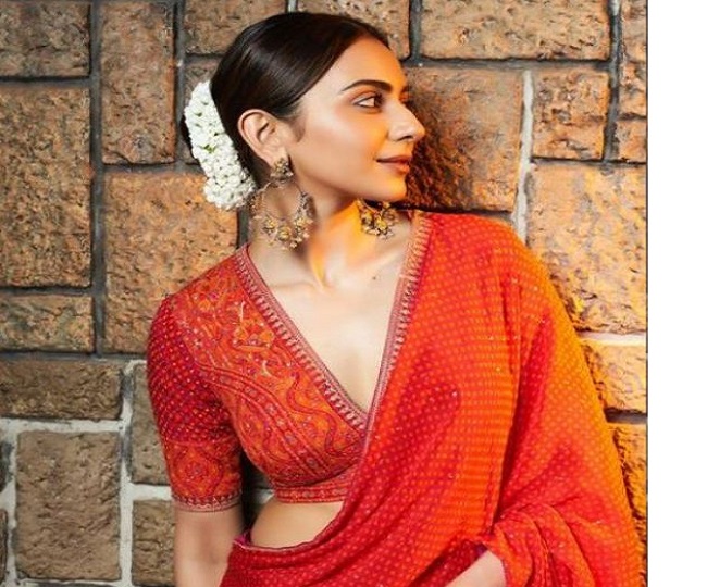 रकुल प्रीत ने इस लाल साड़ी और ऑरेंज कलर की साड़ी में खूबसूरती लग रही है। इसका हैवी ब्लॉउज और डीप नैक डिज़ाइन बहुत ही गॉर्जियस लुक दे रहा है।