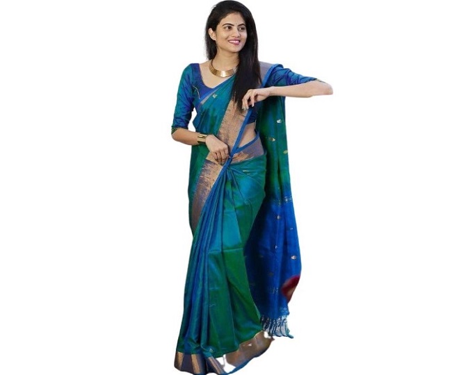 यह Saree Online 5.50 मीटर लंबी है और इसके साथ आपको अनस्टिच्ड मैचिंग ब्लाउज मिलता है। यह साड़ी नीले और हरे रंग के अलावा बहुत ही खूबसूरत रंग ऑप्शन में आती है। SGF11 Womens Saree Price: Rs 1599.