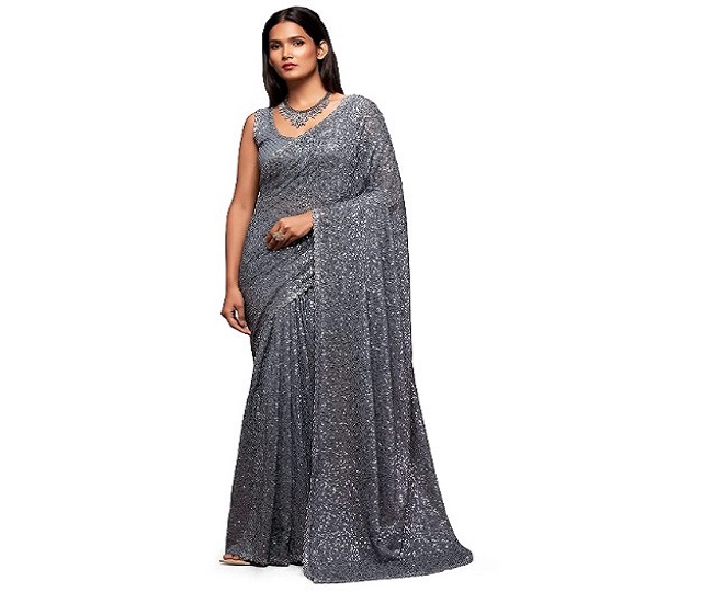 ग्रे कलर की यह Glitter Saree बहुत ही खूबसूरत है। यह सीक्वेंस वर्क वाली हैवी जॉर्जेट साड़ी है, जो मैचिंग ब्लाउज पीस के साथ आती है। इस साड़ी को आप आराम से कैरी कर सकती हैं।