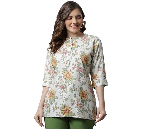 इस Cotton Kurti Short पर सुंदर फ्लोरल डिज़ाइन बना हुआ है, जो गर्मियों के मौसम के लिए सूटेबल है। यह कुर्ता फ़ोल्ड अप स्लीव और मंदारिन कॉलर स्टाइल के साथ आता है। Pistaa's Women's Short Kurti Price: Rs 499.