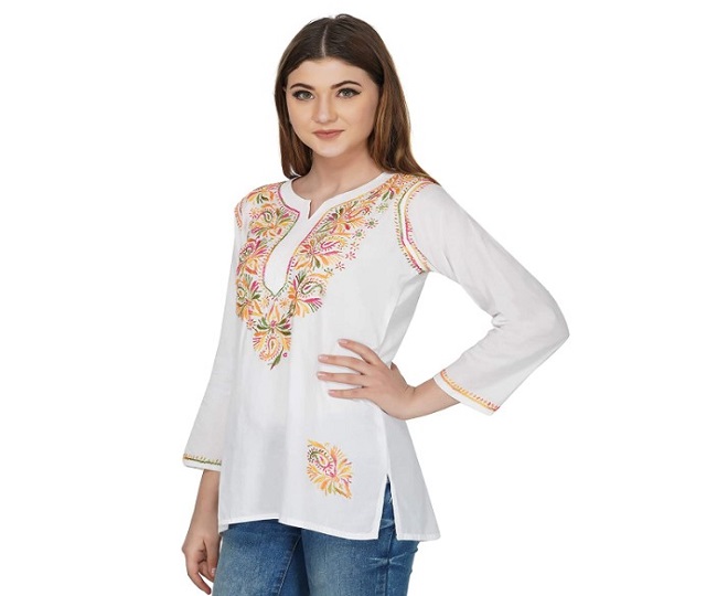 व्हाइट कलर गर्मियों में बहुत ही भाता है। अगर आप व्हाइट कलर में कोई ऑप्शन तलाश रही हैं, तो यह Short Kurti For Women आपके लिए बेस्ट च्वॉइस है। इस शॉर्ट कुर्ती पर चिकनकारी एम्ब्रॉयडरी मिलती है।