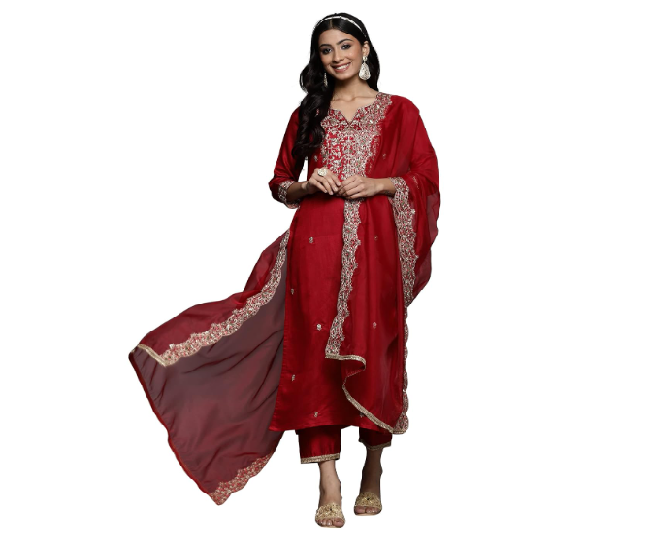 रेड कलर कभी भी फैशन से बाहर नहीं होता है। इसके साथ आपको पैंट, दुप्पटा और कुर्ता मिलता है, जो हर सीजन पर कैरी करने के लिए अच्छी च्वॉइस है। इस Silk Kurta Set For Women की नैक, बाजु और दुप्पटे पर आपको एम्ब्रॉयडरी वर्क मिलता है।