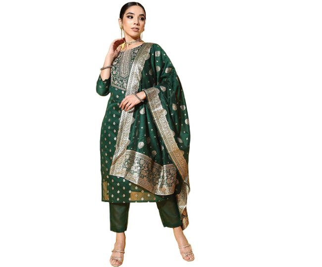 इसको आप गोल्डन ज्वलेरी के साथ पेयर कर बहुत ही अच्छा लुक क्रिएट कर सकती हैं। यह सभी साइज ऑप्शन में आता है। इसका सिल्क फैब्रिक बेहद सॉफ्ट मटेरियल है, जिसको आप आराम से पहन सकती हैं। INDO ERA Silk Kurta Set Price: Rs 1499.