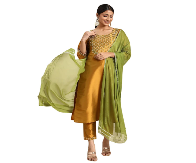 येलो और मेहंदी कलर में आने वाला यह कुर्ता सेट दिवाली, नवरात्रि के लिए बेस्ट च्वॉइस है। इस Silk Kurta Set For Women का सिल्क फैब्रिक बहुत ही स्मूद और सॉफ्ट है, जो स्किन पर चुभता या लगता नहीं है।