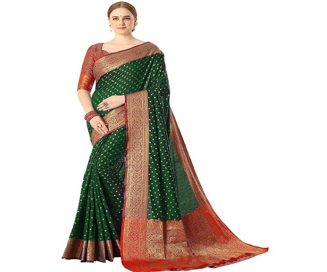 इस Best Silk Saree को आप शादी, ब्याह या पार्टी में आराम से पहन सकते हैं। इसको कैरी करना काफी आसान है। यह साड़ी कंट्रास्ट ज़री के बॉर्डर के साथ आती है। Pujia Women's Silk Saree Price: Rs 729.