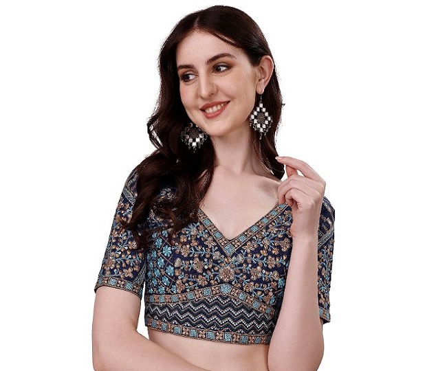 नेवी ब्लू कलर के अलावा इस Saree Blouse Design में आपको और भी कलर के ऑप्शन मिल जायेंगे। यह हाफ स्लीव के साथ आ रहा है, जो पहनने में काफी कम्फर्टेबल है। Vihu New Blouse Design Price: Rs 1299.