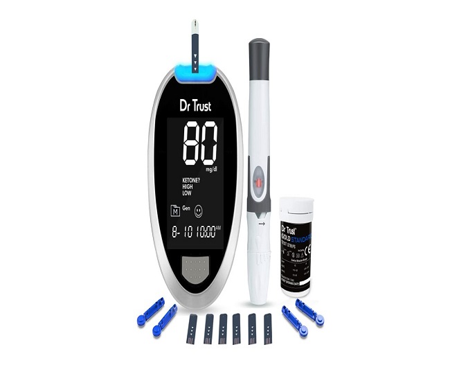 जीडीएच-एफएडी एंजाइम पर आधारित परीक्षण की हुई स्ट्रिप्स के साथ Glucometer ब्लड शुगर के स्तर को सटीक रूप से मापता है। Dr Trust Glucometer Price Rs: 1,999.