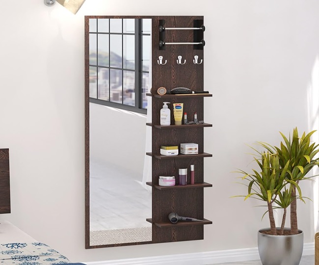 साथ ही Mirror Dressing Table में 3 हुक्स किसी भी वस्तु को टांगने के लिए दिए गए है। 5 शैल्फ सामानों को सहेज तरह से रखने के लिए दिए गए है। सबसे खास बात तो यह है कि इसमें मिरर का आकार पूरा दिया गया है, जिससे आप सर से लेकर पैर तक अपने आप को देख सकते हैं। BLUEWUD Dressing Table Price: Rs 6,499.