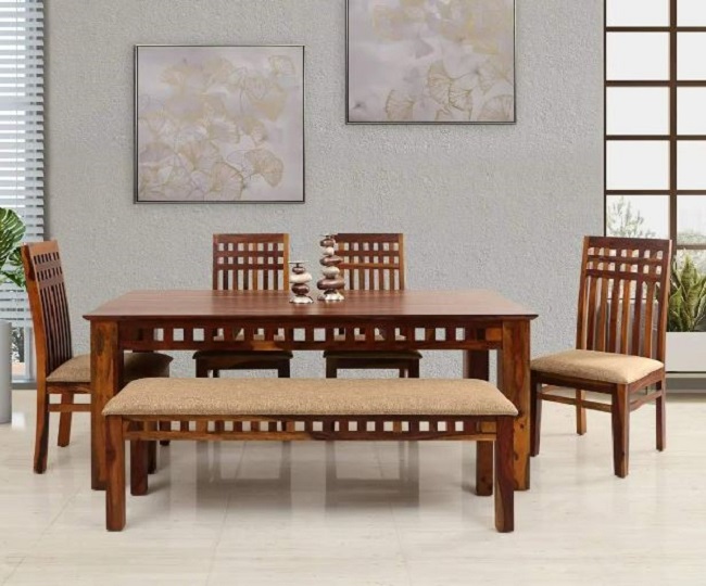यह टेबल 4 चेयर और एक बेंच के साथ आती है, जो काफी स्पेसियस है। इस Wooden Dining Table को यूजर्स ने 4.5 स्टार की रेटिंग दी है। MH Decoart Dining Table Price: Rs 30499.