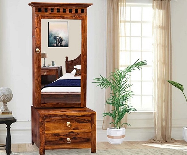 शीशम की लकड़ी से बनी इस Dressing Table Design की क्वालिटी बहुत ही बढ़िया है। यह टेबल 2 ड्रावर और एक डोर स्टोरेज के साथ आती है, जिसमें आप मेकअप, ब्रश और डेली यूज का सामान रख सकती है।