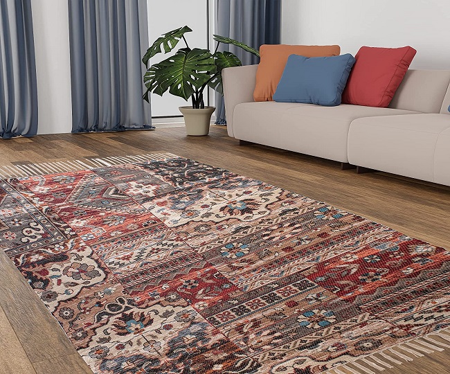 यह हैंडमेड प्रिंट्रिंग Carpet for Living Room दिखने में काफी शानदार है। इस मल्टीकलर कार्पेट को कॉटन ब्लेंड मटेरियल से तैयार किया गया है। HOMADORN Carpet Price : Rs 1,399 .