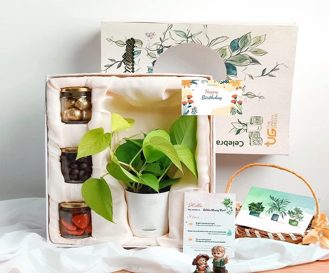 पौधे के साथ मिल रहा है तोहफे का सेट। जी हां, यह Best Money Plants आपके लिए सुख-समृद्धि के साथ-साथ एक बढ़िया उपहार भी है। इसमें आपको स्वयं पानी देने वाले बर्तन के साथ जीवित पौधा, जन्मदिन मुबारक टैग, छोटे पौधे, पौधे के कंकड़ शामिल, घर पर बनी चॉकलेट का सेट मिल रहा है।