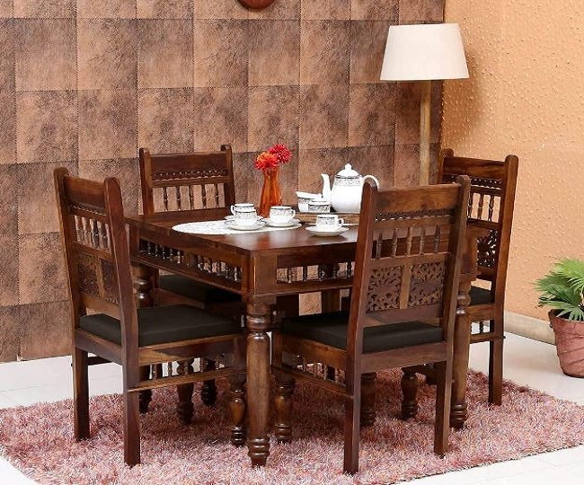 यह डाइनिंग टेबल 4 सीटर कैपेसिटी के साथ आती है, जिन पर पैडेड शीट है. बैठने पर ये चेयर बहुत ही सॉफ्ट और कम्फर्टेबल है. इस डायनिंग टेबल पर टिक से फिनिशिंग की हुई है, जो इसको बहुत ही सुंदर और क्लासी लुक देती है. Custom Decor Dining Table Price: Rs 16799.