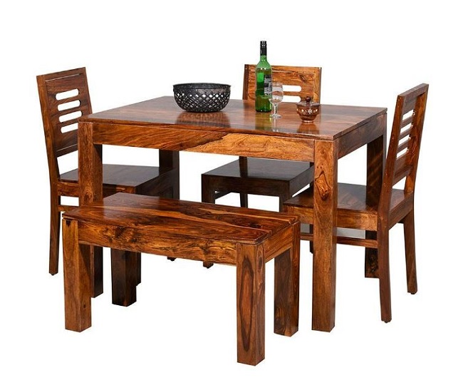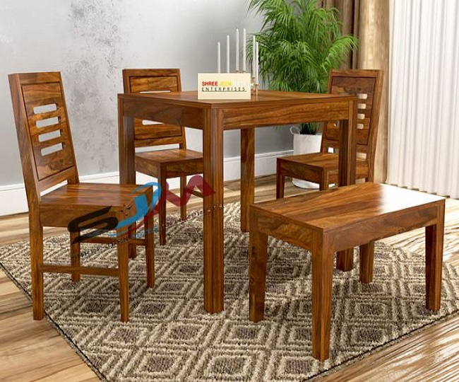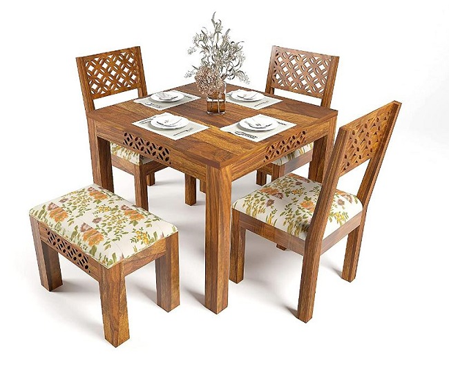यह Dining Table Design 4 सीटर है। इसमें आपको 3 चेयर और एक बेंच मिलती है। यह टिक की लकड़ी से बना हुआ है, जो काफी लम्बे समय तक चलने वाला है। इस 4 Seater Dining Table की फिनिशिंग बहुत ही अच्छी है। यह डाइनिंग टेबल बजट फ्रेंडली है। इस Wooden Dining Table को यूजर्स ने 4.5 स्टार की रेटिंग दी है। Shree Jeen Mata Dining Table Price: Rs 15099.