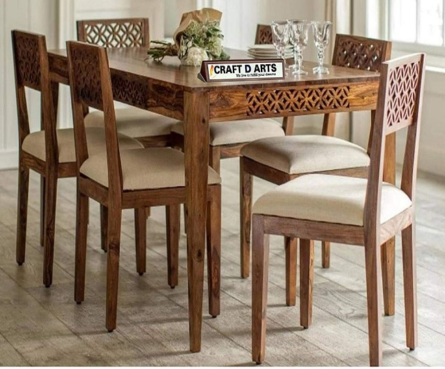 4.5 स्टार की रेटिंग वाली यह वुडेन शीशम Dining Table Set बढ़िया क्वालिटी की है। यह टेबल 6 सीटर है और टेबल का आकार आयताकार है। इसमें आपको कुर्सी पर कुशन मिलते हैं, जो बैठने पर सॉफ्ट और कम्फर्टेबल है। इस पर सॉलिड टिक लकड़ी का डिज़ाइन किया हुआ है। यह आपके घर के लिए बेस्ट dining set है। इसमें आपको 6 चेयर सेट मिलता है। CRAFT D ARTS Dining Table Price: Rs 28000.