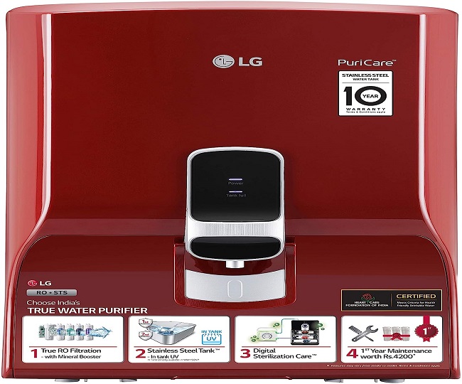 यह LG Puricare Water Purifier मध्यम से बड़े आकार के परिवारों के लिए उपयुक्त है और इसकी भंडारण क्षमता 8 लीटर है। दोहरी सुरक्षा सुविधा सुनिश्चित करती है कि पानी लंबे समय तक ताजा और साफ रहे। वायुरोधी स्टेनलेस स्टील टैंक पानी में बैक्टीरिया और अन्य सूक्ष्मजीवों के विकास को रोकने में मदद करता है, जबकि यूवी प्रक्रिया यह सुनिश्चित करती है कि पानी हानिकारक सूक्ष्मजीवों से मुक्त है। LG Water Purifier Price: Rs 28,990.