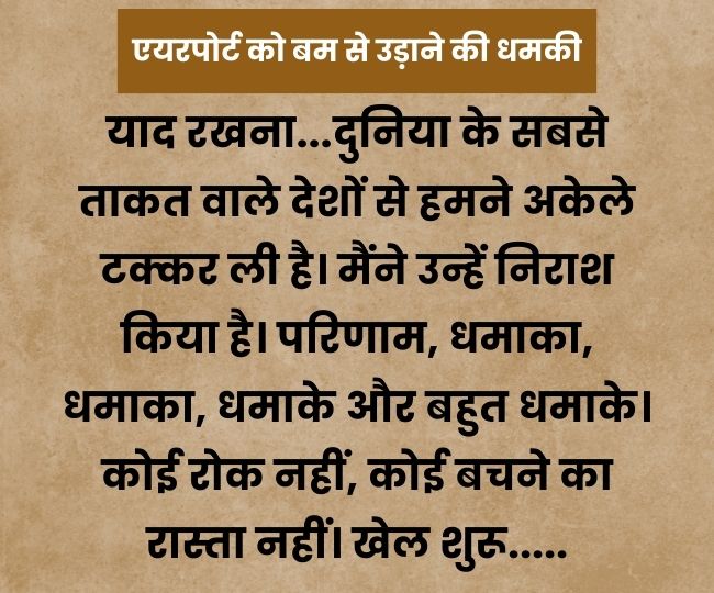 अन्य एयरपोर्ट को उड़ाने की धमकी देने को जो संदेश भेजा गया। वही संदेश यहां भेजा गया है। धमकी भरे ईमेल में लिखा है कि याद रखना दुनिया के ताकतवर देशों से हमने अकेले ही टक्कर ली है। हमने उन्हें निराश किया है। परिणाम, धमाका और धमाके। कोई रोक नहीं, कोई बचने का रास्ता नहीं। खेल शुरू।