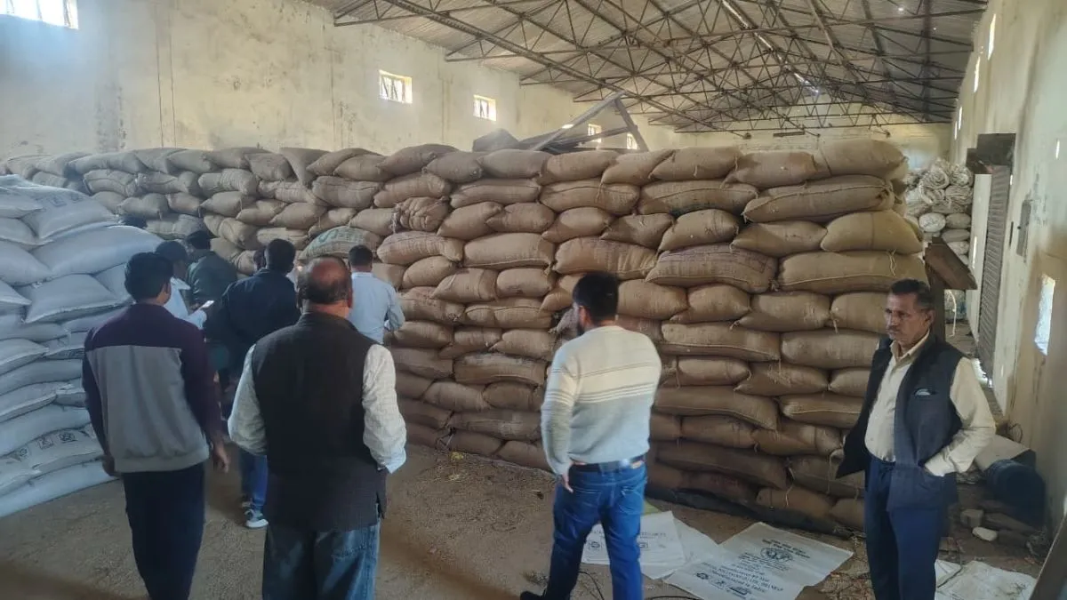 खेरागढ़ में बाजरा खरीद केंद्र पर जांच को पहुंचे अधिकारी।