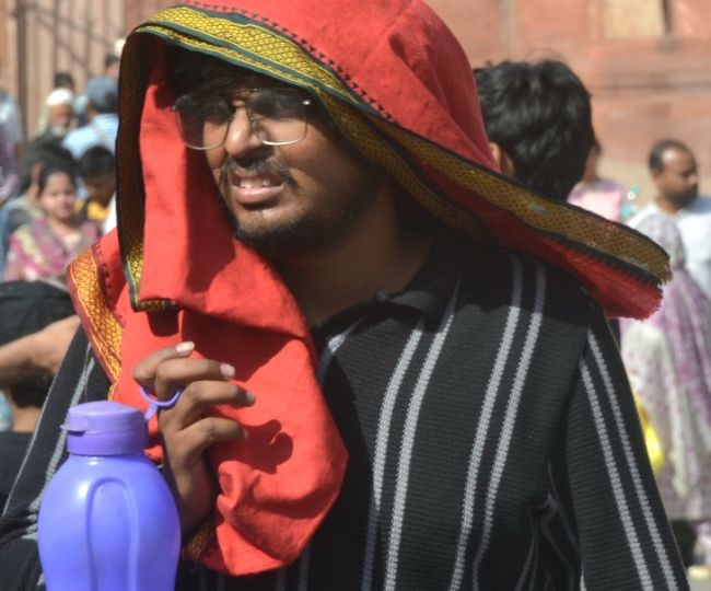 गर्मी से बचने के लिए सिर पर कपड़े का सहारा लेता पर्यटक।