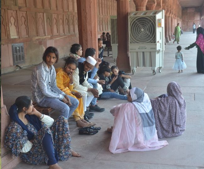 ताजमहल परिसर में लगे कूलरों से हवा खाते पर्यटक। जागरण