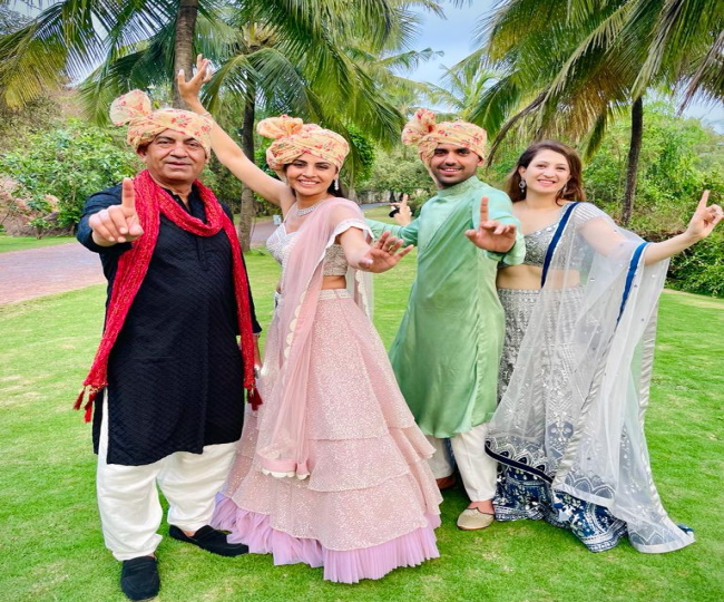 दीपक की शादी के दौरान पिता और भाभी के साथ पिंक ड्रेस में मालती।