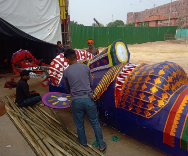 रामलीला मैदान में रावण का पुतला मथुरा के कारीगर जाफर अली पिछले 40 दिन से अपने साथी अमीर अहमद, शाहरूख, नवाब, तोफीक के साथ तैयार कर रहे हैं। उन्होंने बताया कि दशहरे पर रावण के 100 फीट ऊंचे पुतले का दहन होगा, जो श्रीराम से युद्ध के समय अट्टहास करता नजर आएगा। इसे सुतली, वान, सूत, अवरी पेपर, अखबार, लेही आदि की मदद से बांस के फ्रेम पर तैयार कर रंग-बिरंगी रोशनी और आतिशबाजी से सजाया गया है।