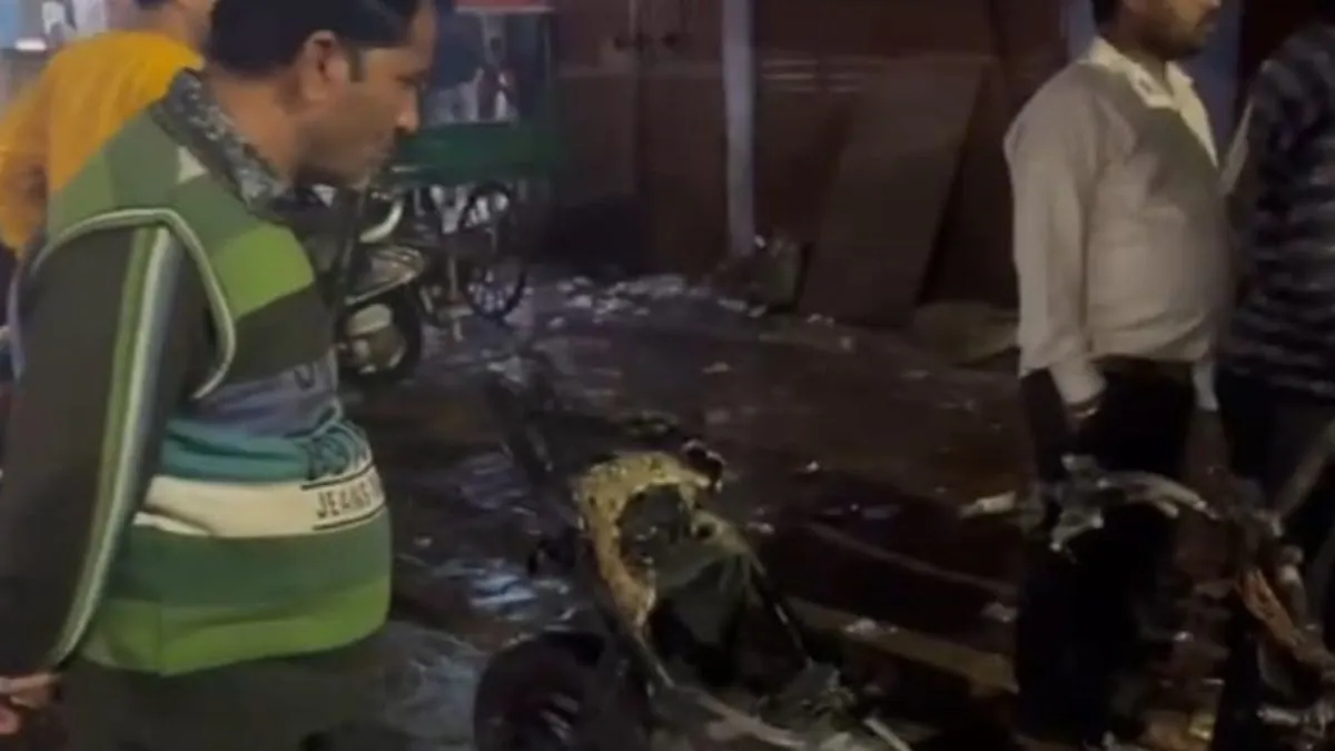 रूई की मंडी चौराहे पर चार्जिंग के दौरान बैटरी फटने से जली ई-स्कूटी और मौके पर जुटे लोग