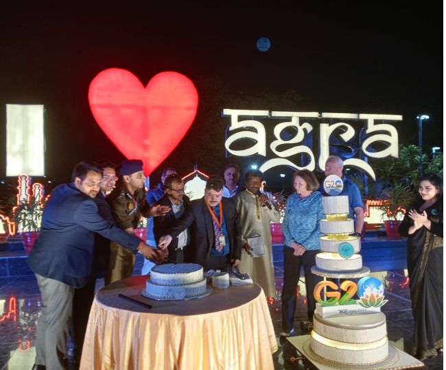 मंडलायुक्त, जिलाधिकारी महोदय, पुलिस आयुक्त,नगरायुक्त ने आई लव आगरा प्वाइंट पर काटा केक।