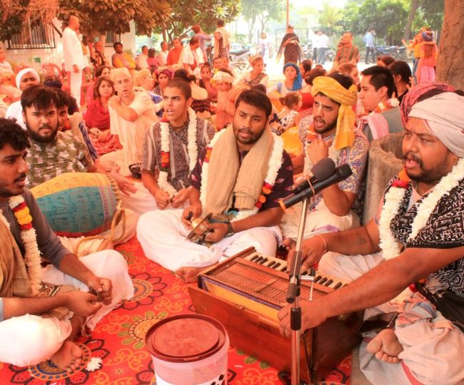 गौशाला में गोपाष्टमी के अवसर पर कीर्तन करते श्रद्धालु।