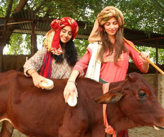 गौशाला में ग्वाल बन गो सेवा करतीं विदेशी युवतियां।