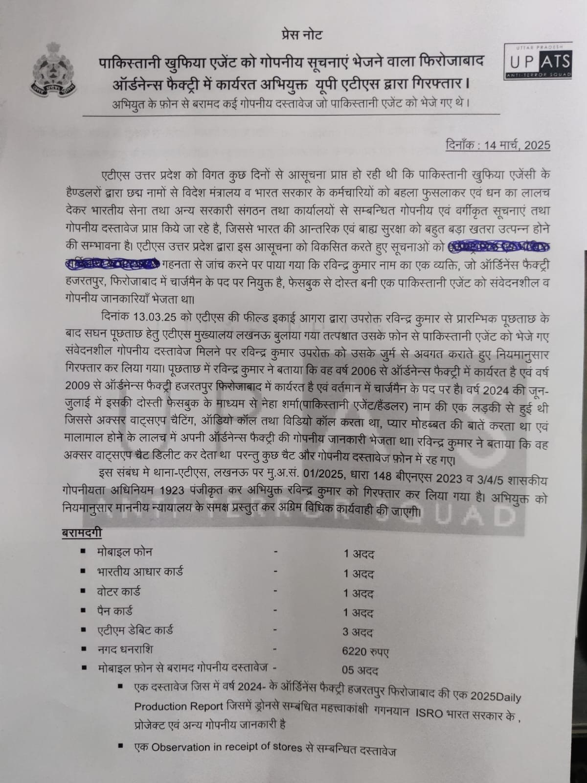 रविंद्र कुमार ने पूछताछ में बताया कि वह वर्ष 2006 से आर्डिनेंस फैक्ट्री में कार्यरत है। वर्ष 2009 से आर्डिनेंस फैक्ट्री हजरतपुर फिरोजाबाद में चार्जमैन के पद पर है। आरोपित ने बताया कि जून 2024 उसकी मित्रता फेसबुक के माध्यम से नेहा शर्मा (पाकिस्तानी एजेंट, हैंडलर) नाम की एक युवती से हुई थी।