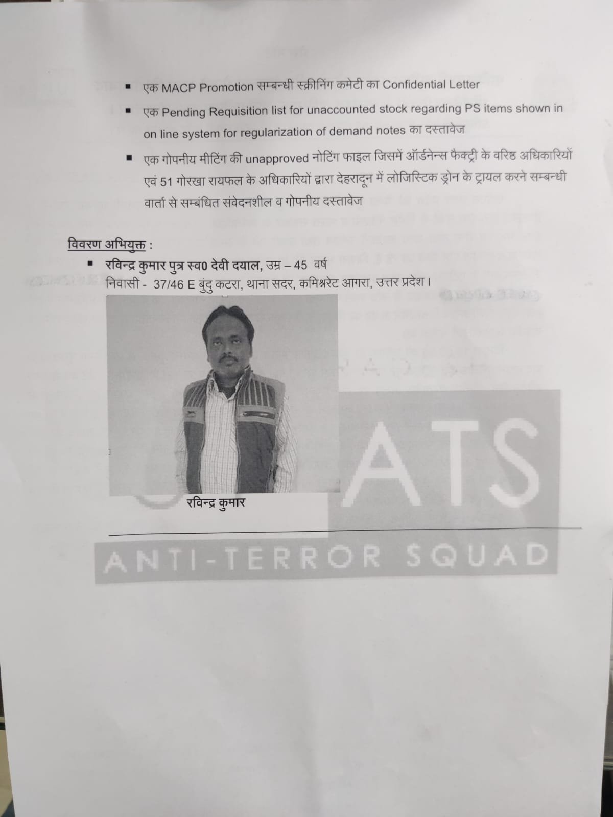 एटीएस को रविन्द्र के मोबाइल से फैक्ट्री के अधिकारियों, 51 गोरखा राइफल्स के अधिकारियों द्वारा लाजिस्टिक ड्रोन के ट्रायल से संबंधित गोपनीय जानकारी समेत अन्य महत्वपूर्ण जानकारियां मिली हैं । आरोपित के विरुद्ध एटीएस के लखनऊ थाने में मुकदमा दर्ज किया गया है।