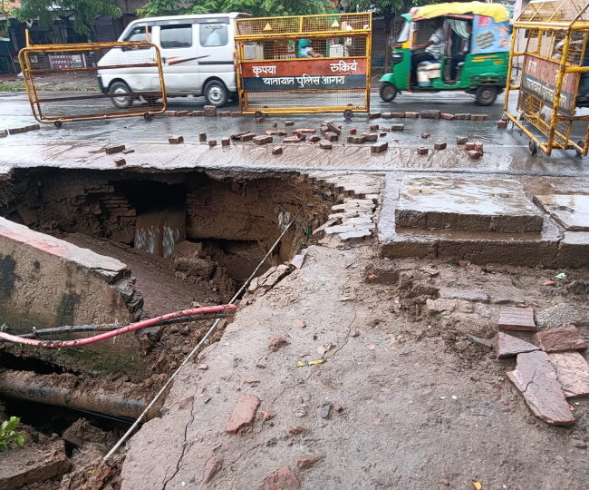 Rain in Agra पूरे आगरा मंडल में बुधवार रात 11 बजे से बारिश शुरू होने के बाद गुरुवार दोपहर एक बजे तक जारी है। आगरा में जगह जगह जलभराव और सड़कें धंसने के मामले सामने आए हैं। बिजली गिरने से एक महंत घायल हुए हैं। फिरोजाबाद में भी नुकसान है।