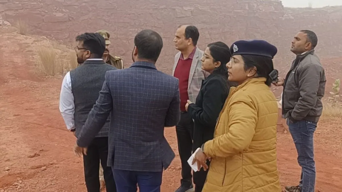 अरावली पर्वत श्रंखला पर खनन की जांच करने पहुंचीं एडीएम वित्त राजस्व शुभांगी शुक्ला। साथ हैं एसडीएम रिषि राव और एसीपी प्रीता दुबे व अन्य अधिकारी। सौजन्य प्रशासन