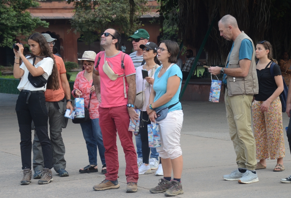 ताज पर स्पेनिश-फ्रेंच भाषा में पर्यटकों को समझा रही पर्यटन पुलिस