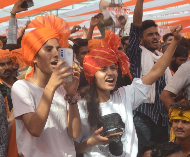 आगरा: रक्त स्वाभिमान महासम्मेलन में आक्रोश व्यक्त करतीं युवतियां। जागरण
