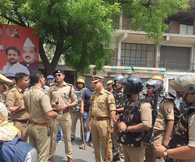 रामजीलाल सुमन के आवास के बाहर पुलिस बल।