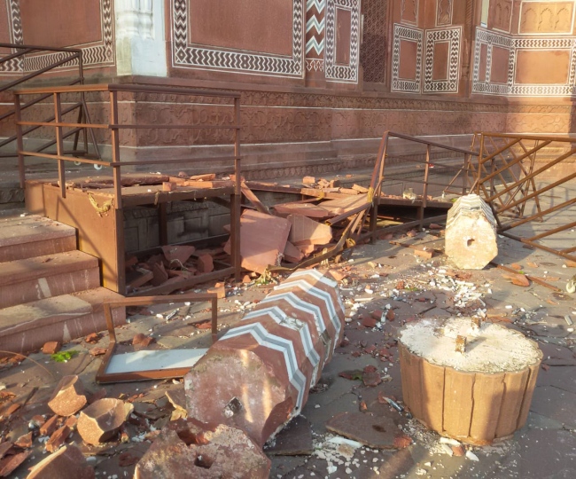 11 अप्रैल, 2018 को आए तूफान में रॉयल गेट का उत्तरी-पश्चिमी जिगजैग पिलर और छज्जा टूटकर वीडियो प्लेटफार्म पर आ गिरा था। फर्श के पत्थर धंसने के साथ ही वहां बनी रैंप टूट गई थी। दक्षिणी गेट का करीब आठ फुट ऊंचा उत्तरी-पश्चिमी पिलर टूट गया था। दीवार पर गिरने से उसका पत्थर चटक गया था। पिलर का ऊपरी पत्थर गिरने से नीचे बनी सीढ़ी का पत्थर टूट गया था। मुख्य मकबरे में यमुना किनारा की तरफ बॉर्डर में लगे काले संगमरमर के पत्थर टूटकर नीचे गिरे थे।