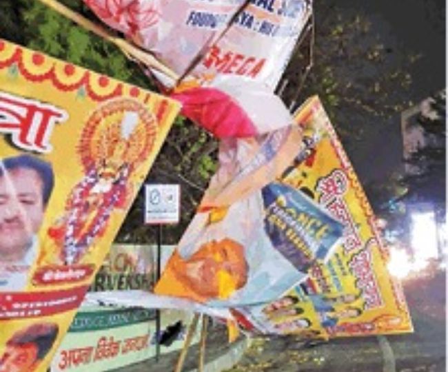 शहर में सड़कों पर गिरे होर्डिंग्स