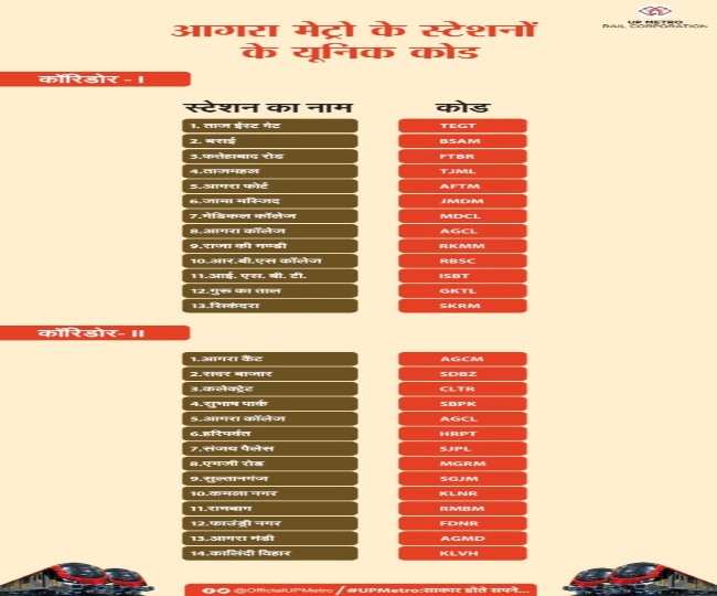 ताजनगरी के प्रमुख रेलवे स्टेशन आगरा कैंट रेलवे स्टेशन के लिए ‘AGC’ कोड का प्रयोग किया जाता है, अब आगरा कैंट मेट्रो स्टेशन के लिए ‘AGCM’ कोड का प्रयोग किया जाएगा। वहीं, आगरा फोर्ट रेलवे स्टेशन के लिए AF का प्रयोग किया जाता है, तो वहीं आगरा फोर्ट मेट्रो स्टेशन के लिए AFTM का प्रयोग किया जाएगा।