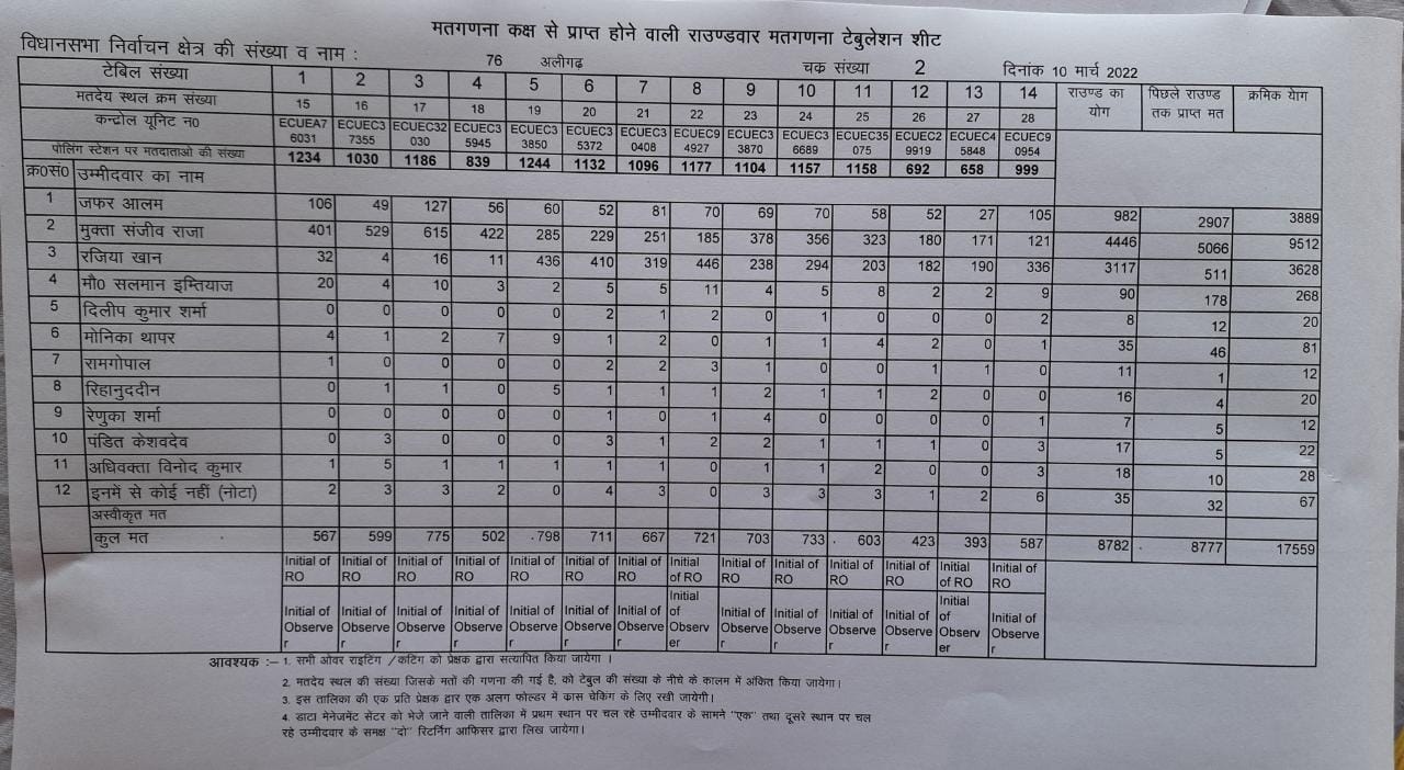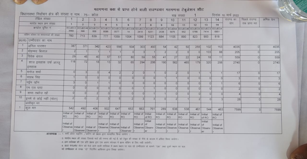 सबसे अधिक 11-11 प्रत्याशी अतरौली व शहर विधानसभा में है। पूर्व मुख्यमंत्री कल्याण सिंह के पौत्र व वित्त राज्य मंत्री संदीप सिंह मतगणना स्थल पर पहुंच गए। वे अतरौली विधानसभा क्षेत्र से भाजपा प्रत्याशी हैं। सबसे कम पांच प्रत्याशी इगलास में है।